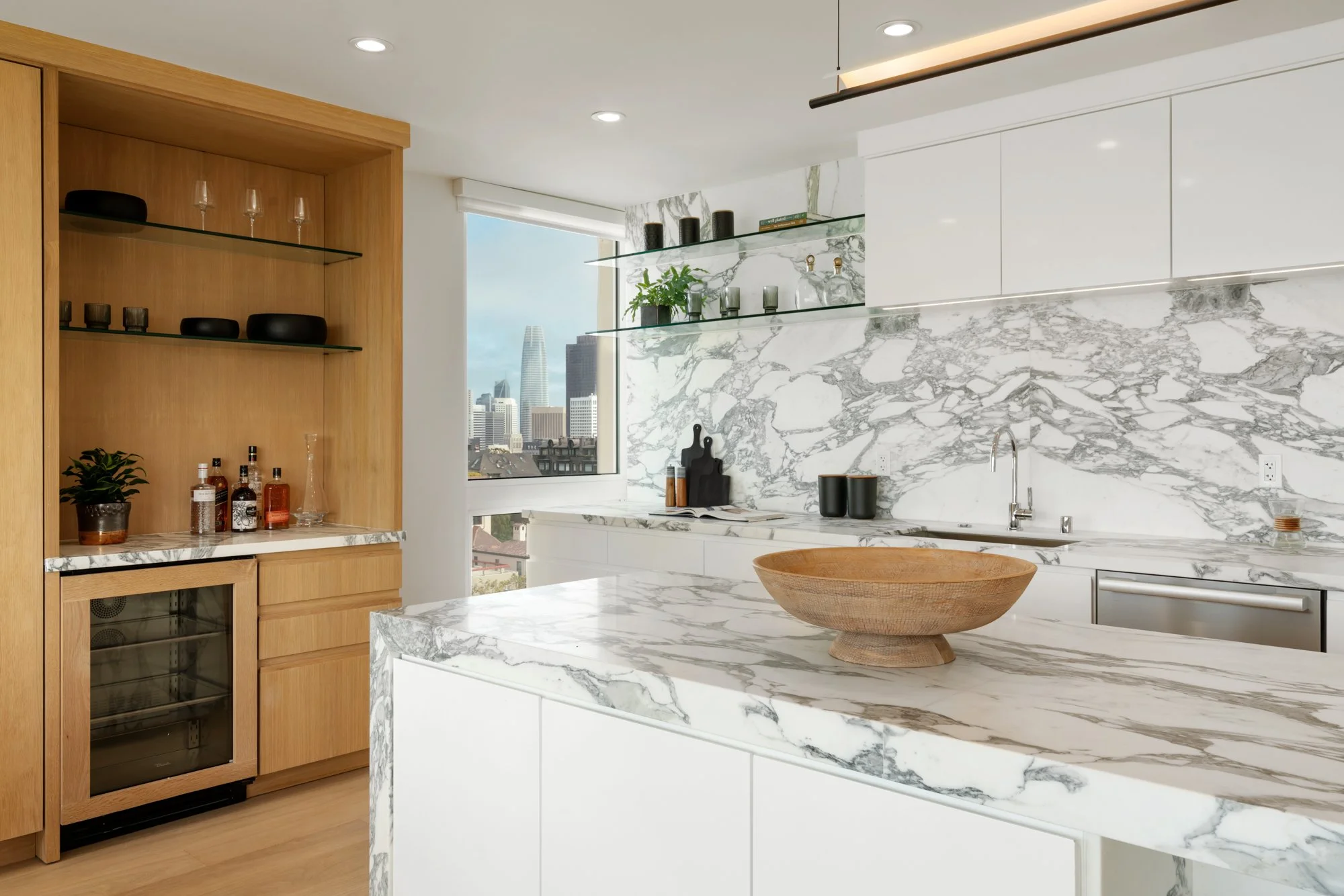 Perched at the top of Russian Hill on a tree lined flat block this spectacular home features quintessential San Francisco Bay, Coit Tower, Golden Gate Bridge, Alcatraz, and stunning water views. This completely renovated 8th floor home was originally designed by Architect Stephen Sutro and painstakingly remodeled with the finest finishes. The previous owner and designer selected wide plank white oak flooring, Calacatta Corchia marble, and paneled walls in the open concept kitchen which look directly over the Bay with near unobstructed views.